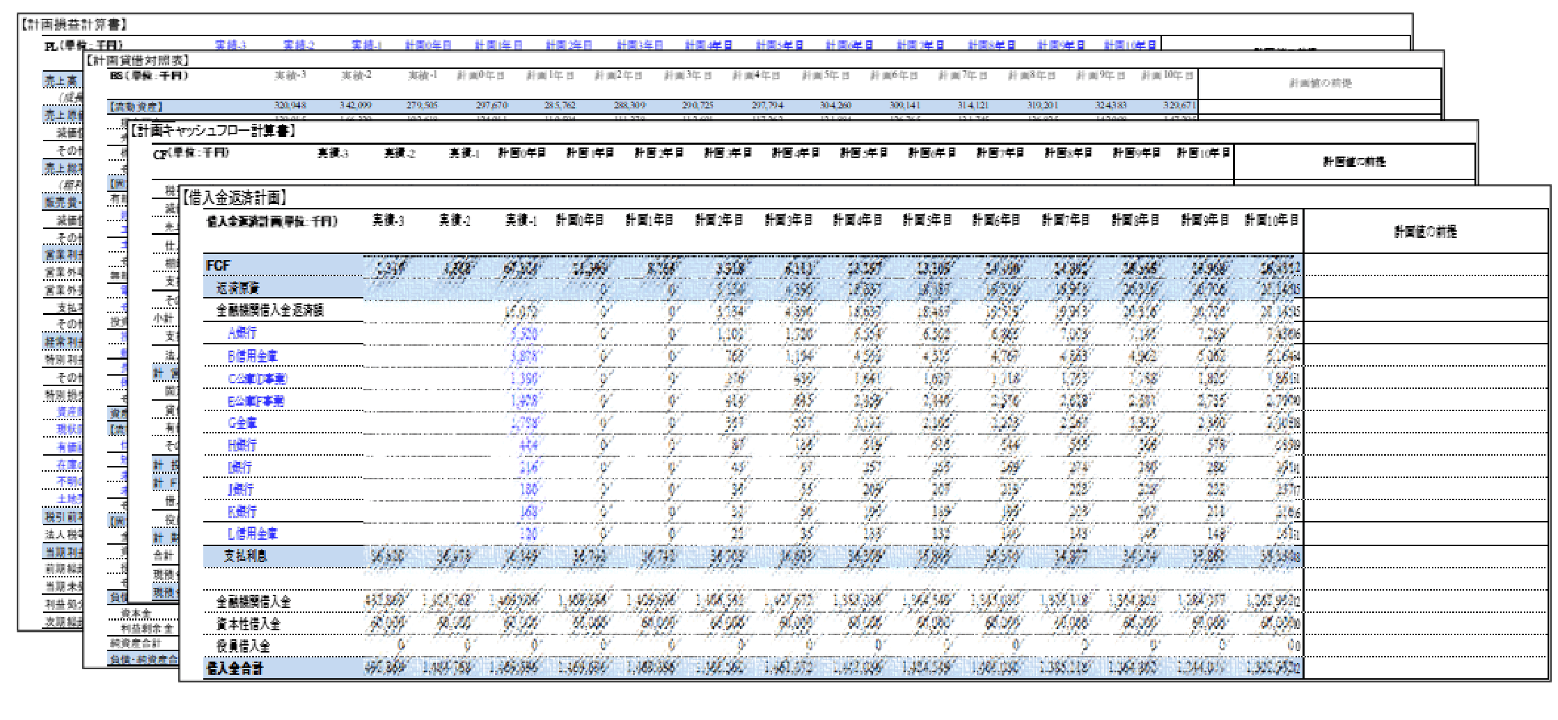 PL計画とそれに連動するBS計画、CF計画を含めた3表計画を策定します。KPIや資金計画、投資計画も含めた形でモデルに落とし込み事業に合わせたシミュレーションが可能となります。